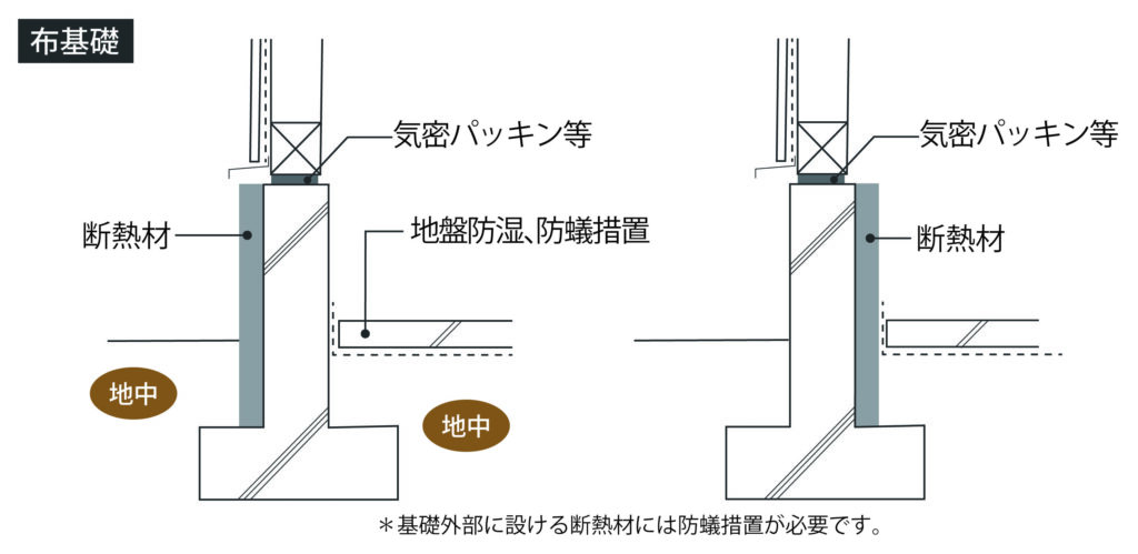 • 外基礎断熱:基礎の外側に断熱材を連続させる。